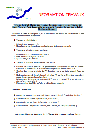Des travaux de réhabilitation des réseaux des eaux usées débuteront le 23 février 2026 pour une durée de 5 mois, sur les communes de Sassetot-le-Mauconduit, Saint Martin aux Buneaux, Ancretteville sur Mer et Saint Pierre en Port.